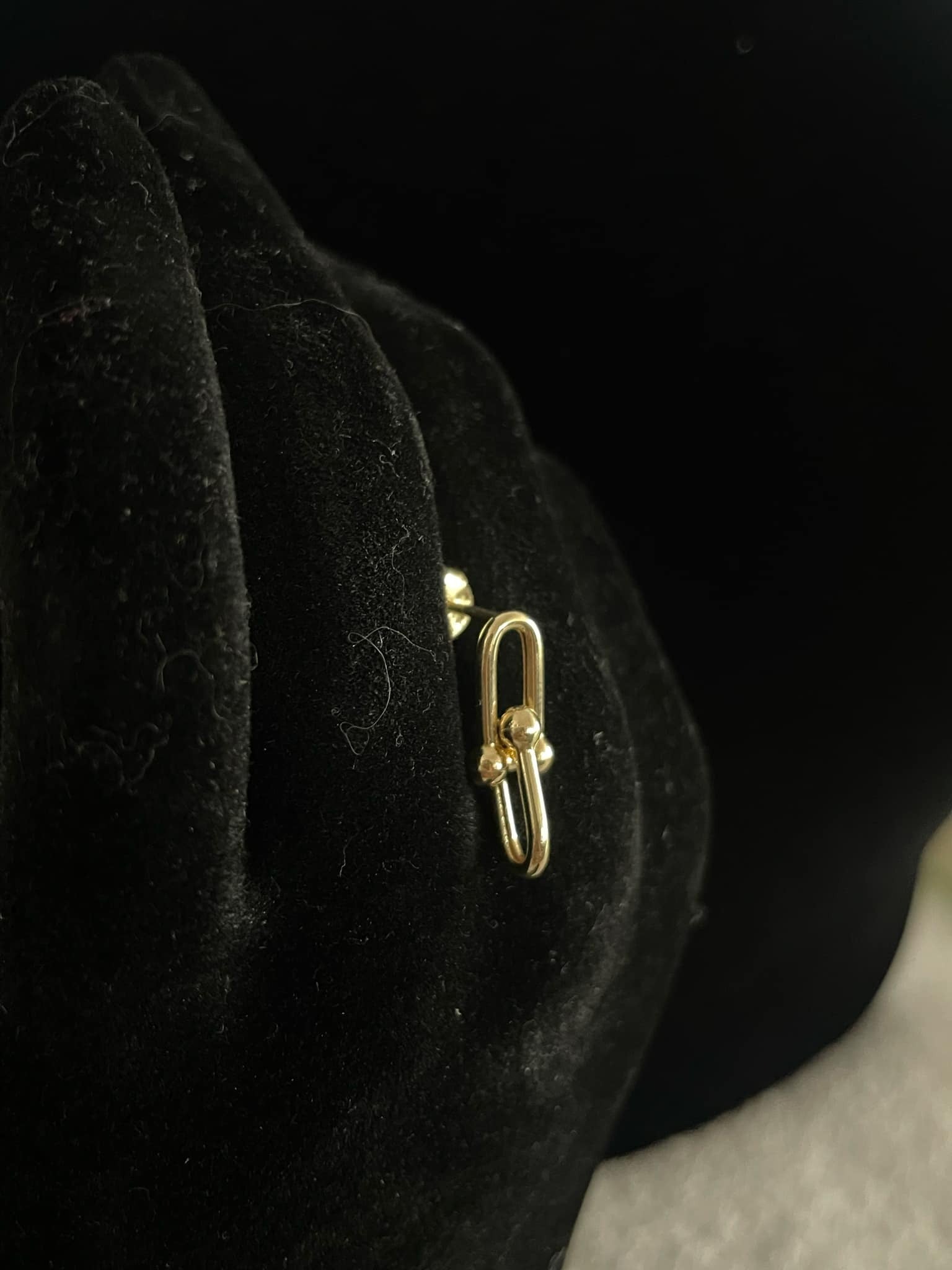- Style: Paperclip-inspired stud earrings with dual gold ball accents