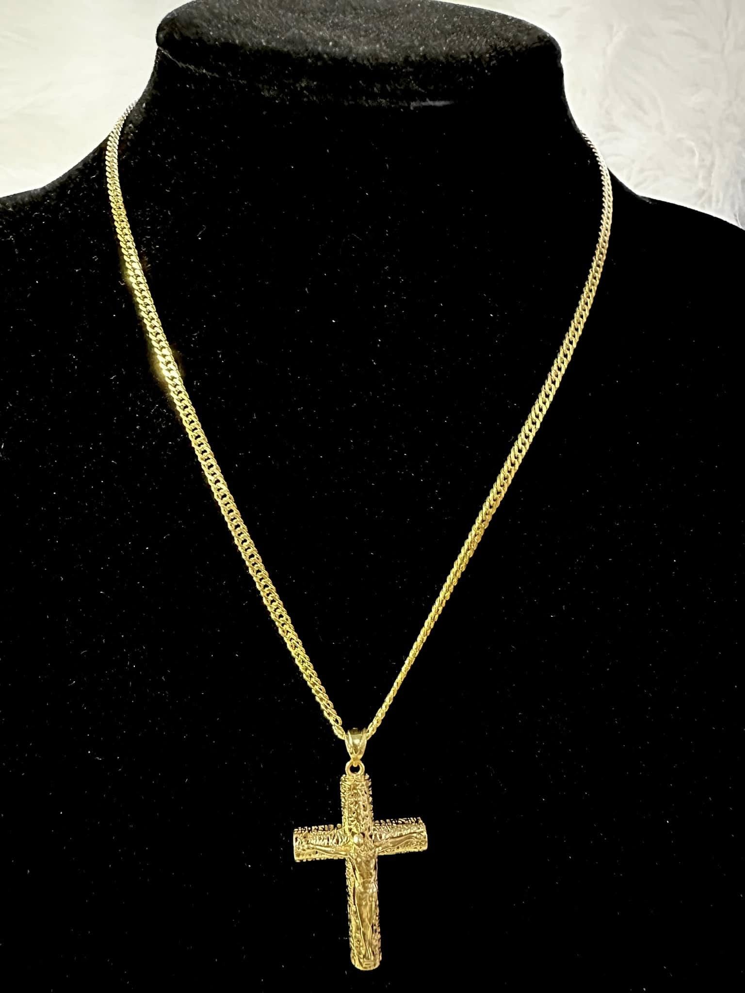 - Design: Features a detailed cross pendant with a textured finish