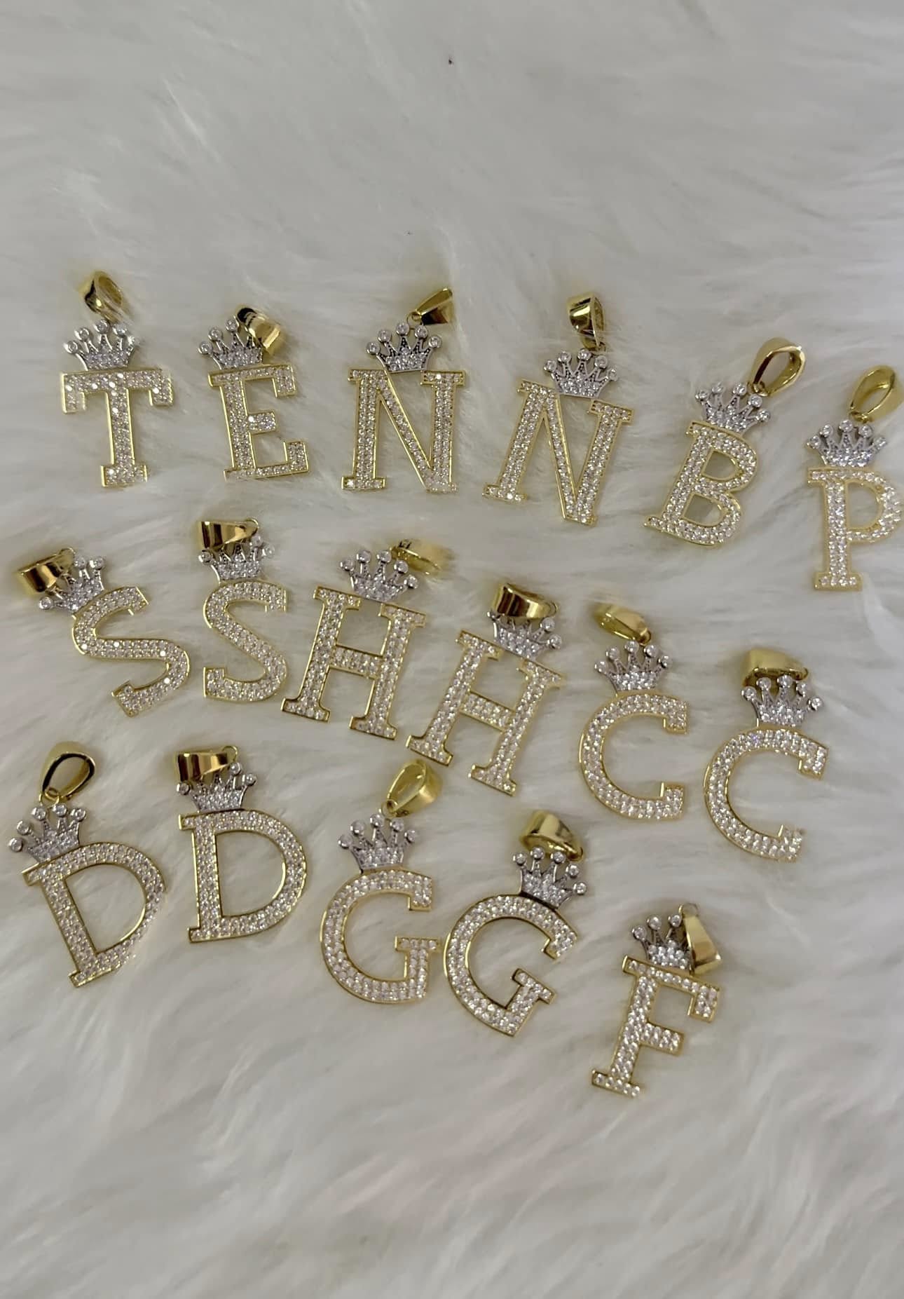 - Design: Initial letter pendant with a crown accent, encrusted with cubic zirconia stones, featuring a loop for chain attachment