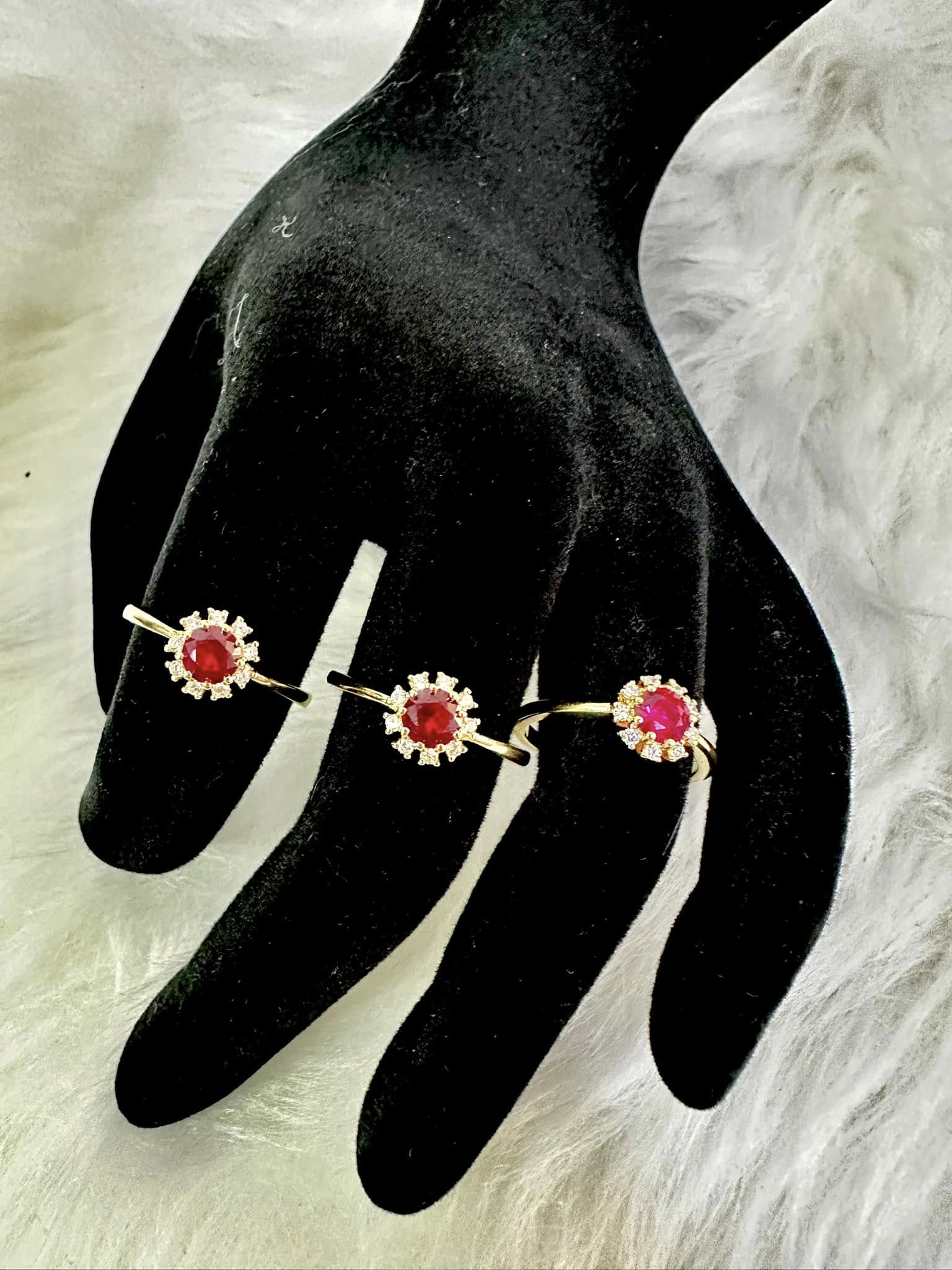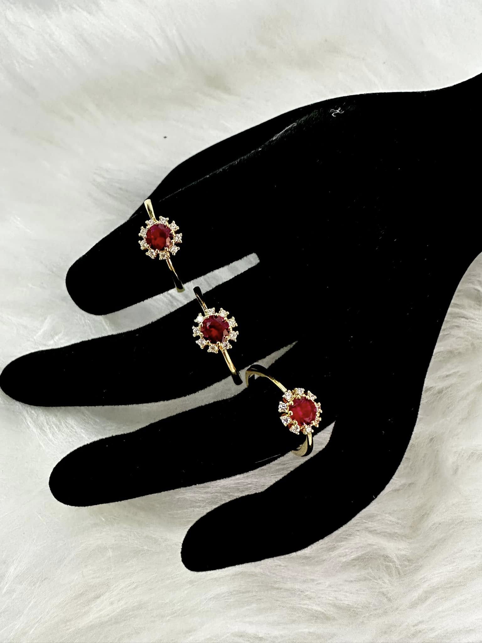 - Design: Ruby center stone surrounded by cubic zirconia accents, set in a gold band