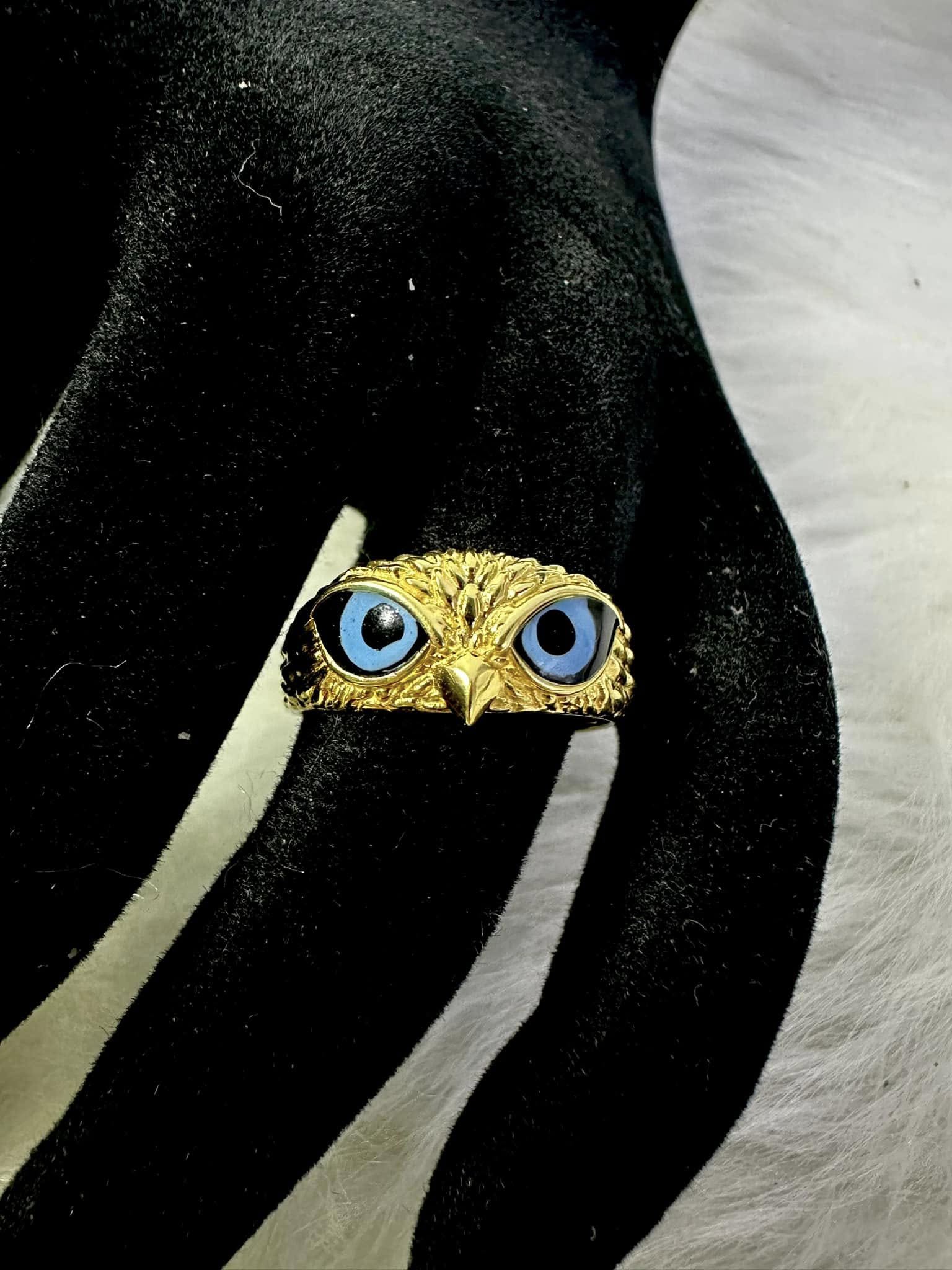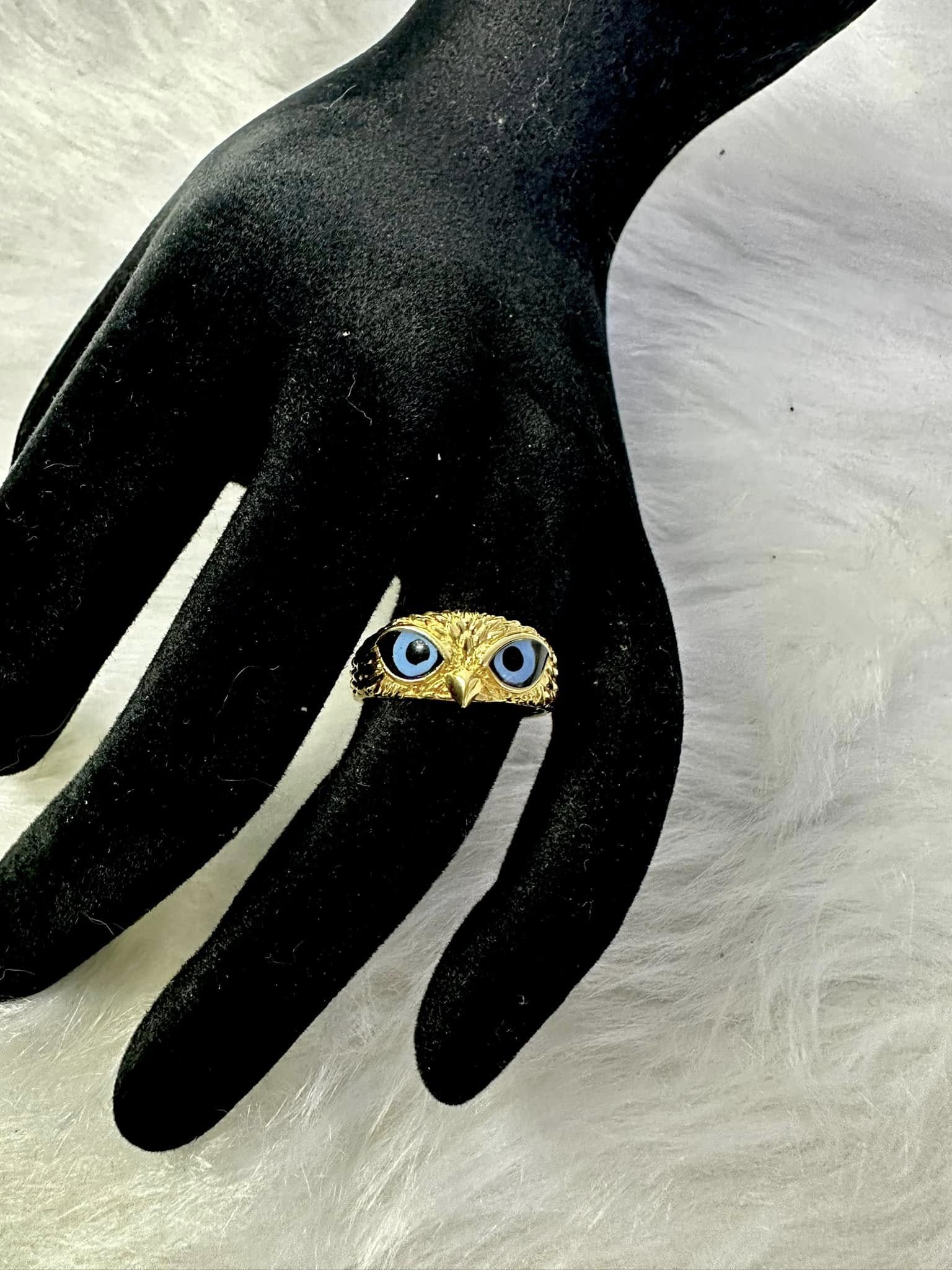 - Design: Features an owl-shaped design with blue gemstone eyes and intricate detailing
