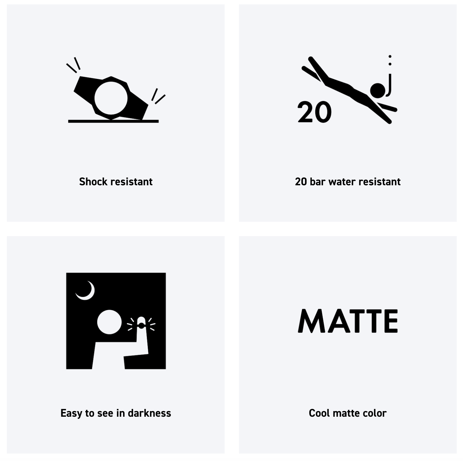 - Light: LED light with auto light switch, selectable illumination duration (1.5 seconds or 3 seconds), afterglow