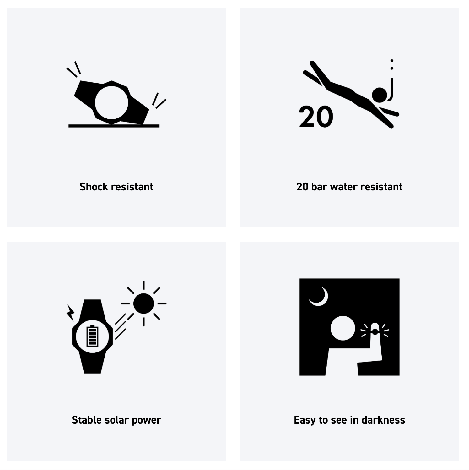 - Energy saving feature: Power Saving (Turns off the display when the watch is left in the dark)